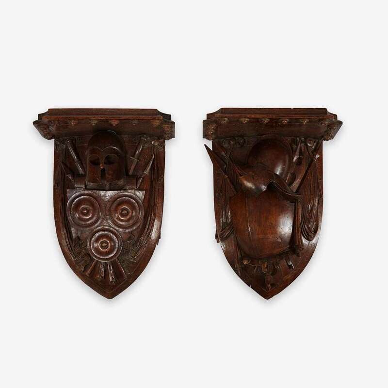 A pair of large Arts & Crafts carved oak armorial wall brackets circa 1865