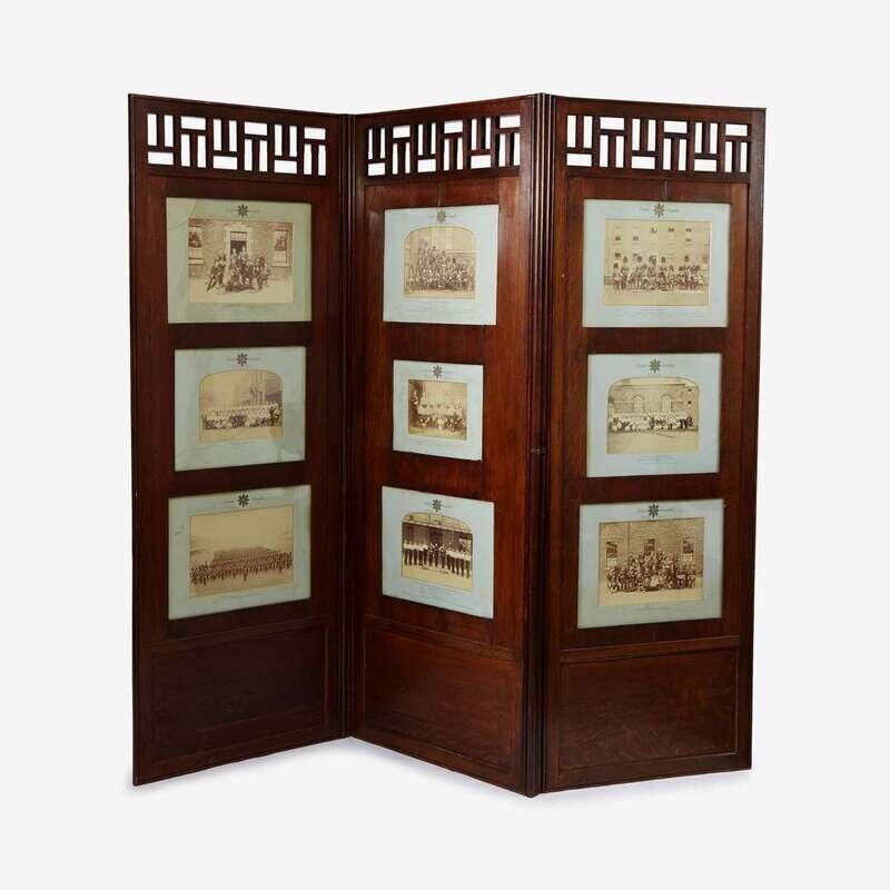 An Aesthetic Movement oak floor screen mounted with photographs of the Scots Guards circa 1895
