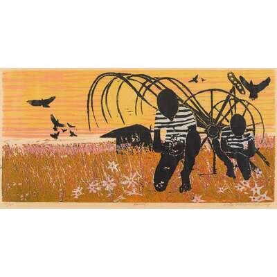 1963, pencil signed, titled, dated and inscribed "imp," numbered 174/210. Color woodcut on thin wove paper.