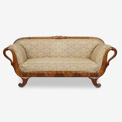 A Biedermeier parcel-ebonized figured walnut and upholstery swan sofa 19th century