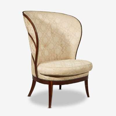 The high shaped back surrounding a circular cushioned seat above four klismos legs.