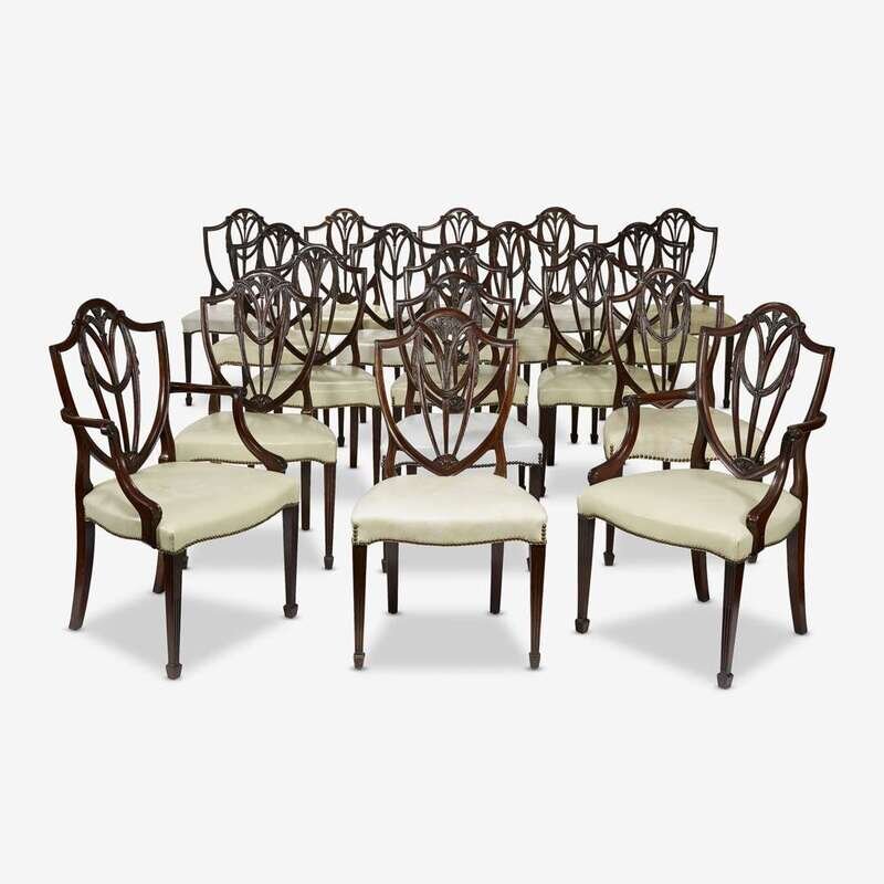 After the model by Thomas Sheraton, the set comprising sixteen side chairs and two armchairs, each with shield and feather backs above shaped seat on tapering legs terminating in block feet. (18).