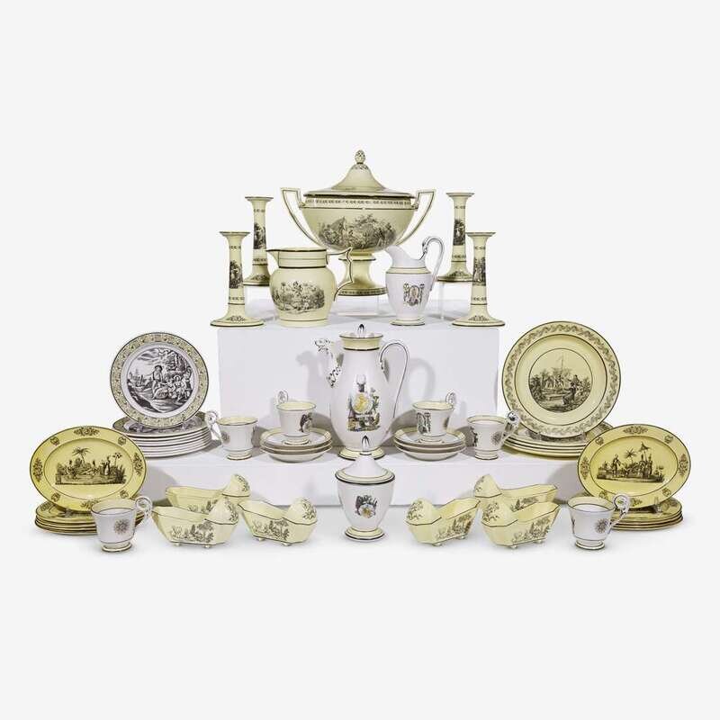In a yellow and black palette, comprising sixteen oval bread plates, nine salad plates, eight cradle-form sauce dishes, six teacups and six saucers, five dinner plates, four candlesticks, and one each coffee pot, covered sugar, creamer, water pitcher, and urn-form covered tureen. (59).