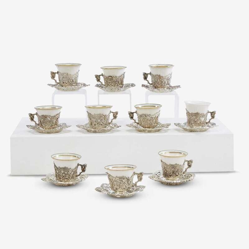Ten sterling silver pierced and repoussed demitasse cups and saucers The Mauser Manufacturing Co., New York, NY, circa 1900