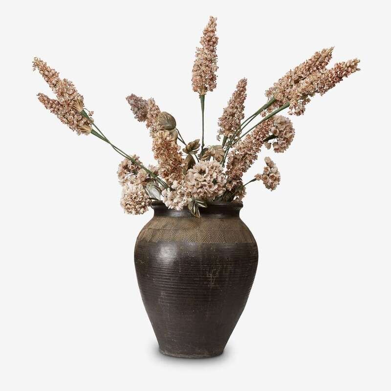 In the form of a mass of buddleia and lilies, composed entirely of local Filipino shells, in a large Burnay pottery vase.