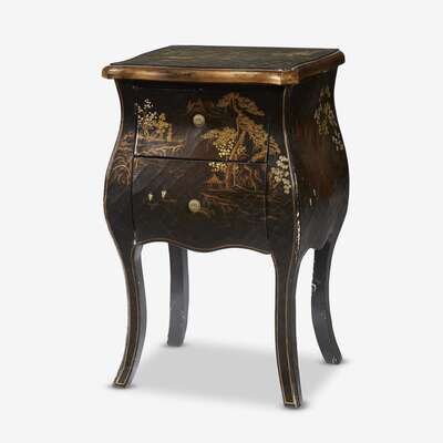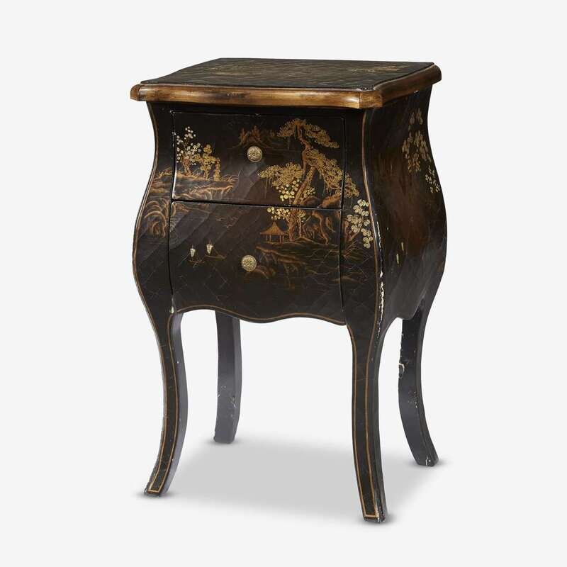 Of bombé form on cabriole legs, the whole overall lacquered in the chinoiserie style in gold on a black ground.