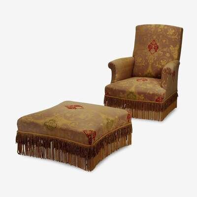 The chair and ottoman all over upholstered in paisley patterned fabric, with scrolling arms, and bullion-fringed skirt, the concave square shaped ottoman upholstered en suite.