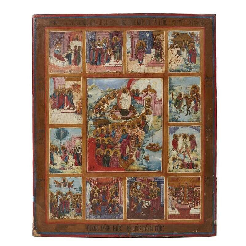 Centering an image of the Resurrection surrounded with twelve (12) scenes from the life of the Mother of God, including the Birth of the Virgin, the Presentation of the Virgin in the Temple, the Annunciation, the Nativity, the Adoration of the Magi, the Baptism of Christ, The Entry of Christ into Jerusalem, the Transfiguration, the Resurrection, Pentecost, the Dormition of the Virgin, and the Elevation of the Cross.
