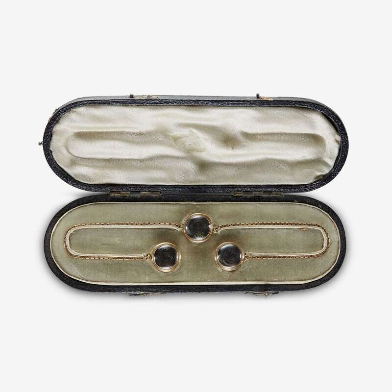 Comprised of three linked buttons enclosing circlets of hair, in original fitted case.