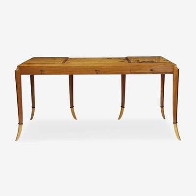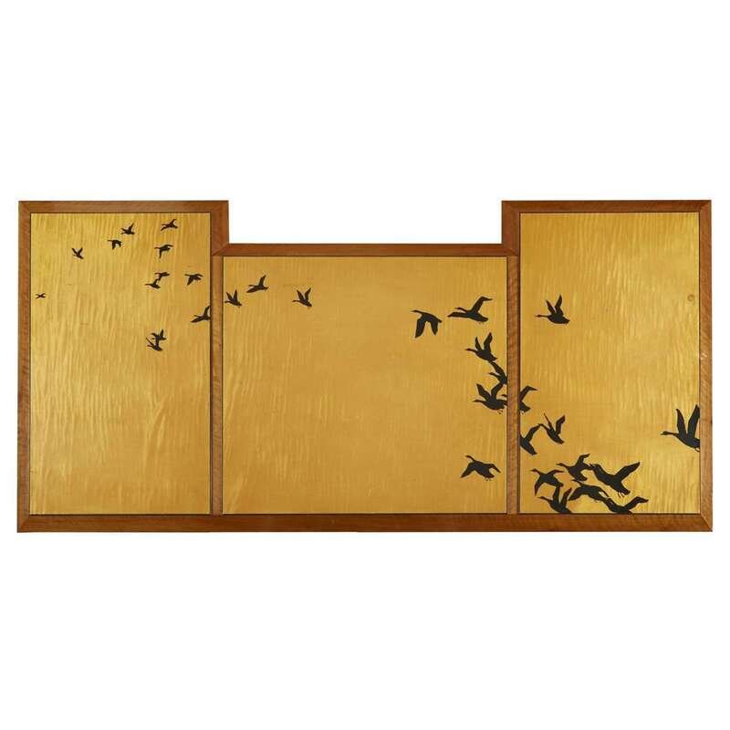 The paneled top inset with silhouettes of flying geese above three frieze drawers, the whole raised on six sabre legs.