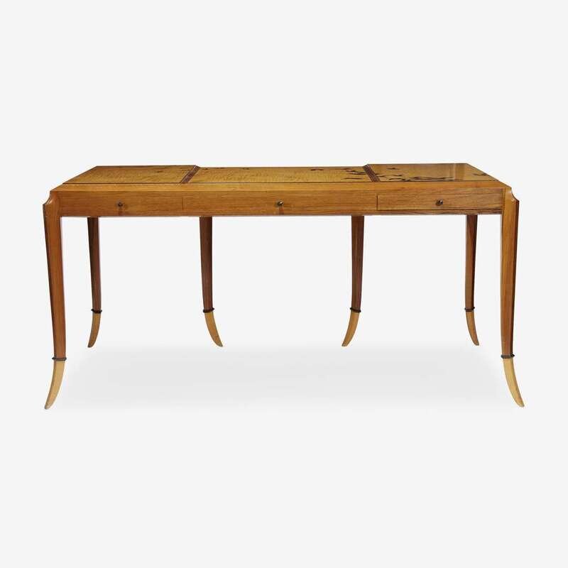 An English walnut, curly maple, ebony, lacquer, and India ink "goose desk" Wendell Castle (American, b. 1932), 1983