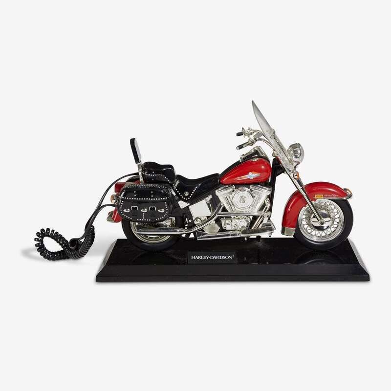 In the form of a red Harley Davidson Heritage Softail motorcycle, mounted on black base.