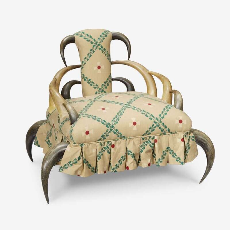 The back, arms, and legs comprised of 14 cow horns, the rectangular back and shaped seat upholstered in a trellised pattern with dust ruffle.
