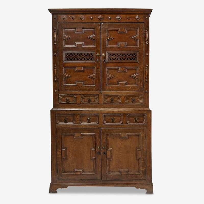 In two parts, the upper section with moulded cornice above two cupboard drawers over two short drawers, the lower section with two frieze drawers over two further cabinet doors enclosing shelves.