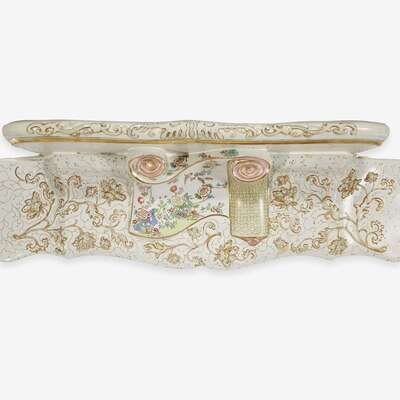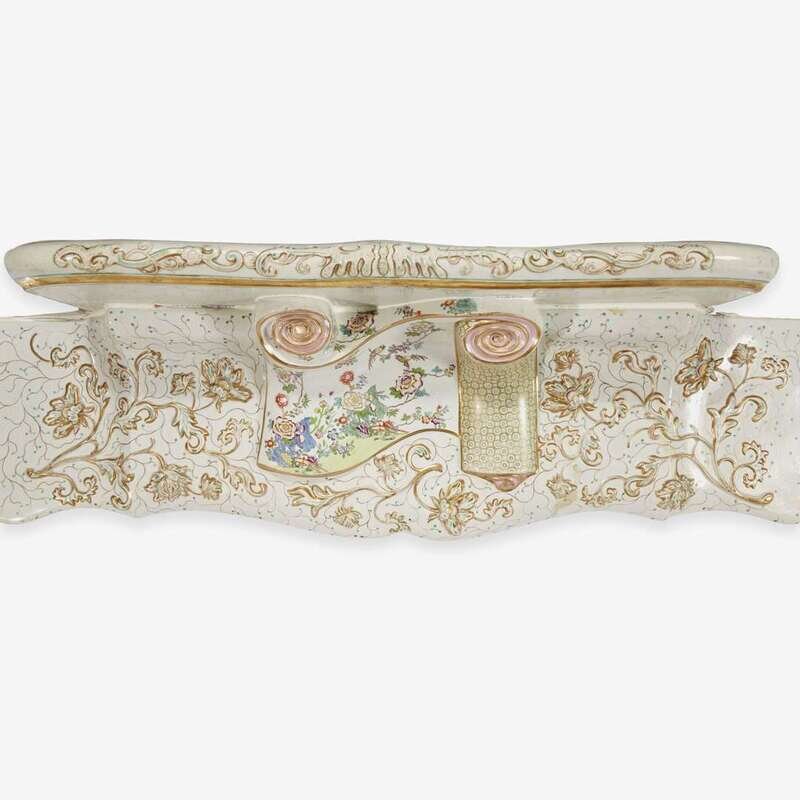 The white ground decorated in a famille rose palette, the mantle decorated with a sculpted banner painted with Chinese motifs, the lion-headed capitals above molded column supports with fretwork modeled feet. (Please refer to online condition report.).