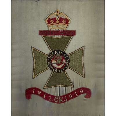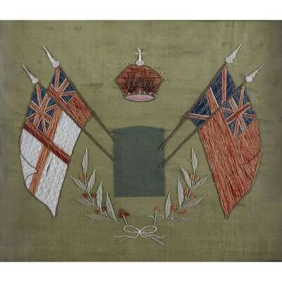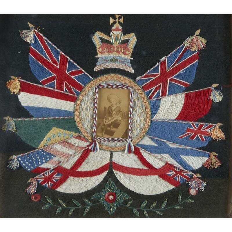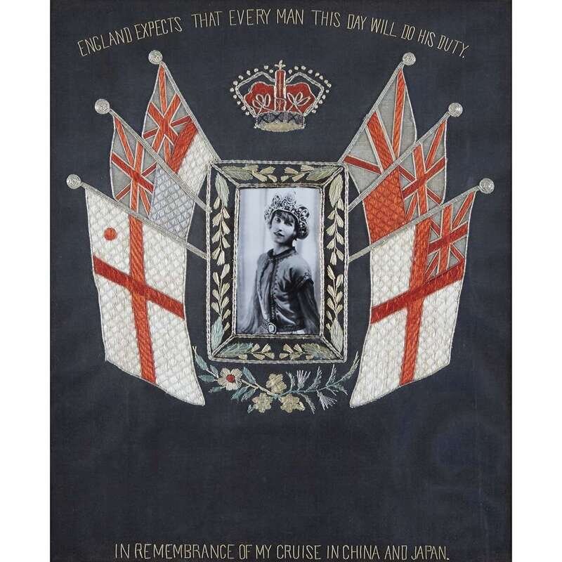 The first depicting The Kings Royal Rifle Corps medal above red ribbon detailing soldier intials and years of service: "1911 CK 1919," woven on silk; the second with British crown above portrait of a child, surounded by wool-woven combat tour flags and stylized roses; the third showing central photograph of a woman in beaded headdress, surounded by floral border and British naval and national flags, the top and bottom with woven text reading: "ENGLAND EXPECTS THAT EVERY MAN THIS DAY WILL DO HIS DUTY" and "IN REMEMBRANCE OF MY CRUISE IN CHINA AND JAPAN"; The fourth missing central photograph or patch, surmounted by religious crown and flanked by British ensigns and national flags. (4).