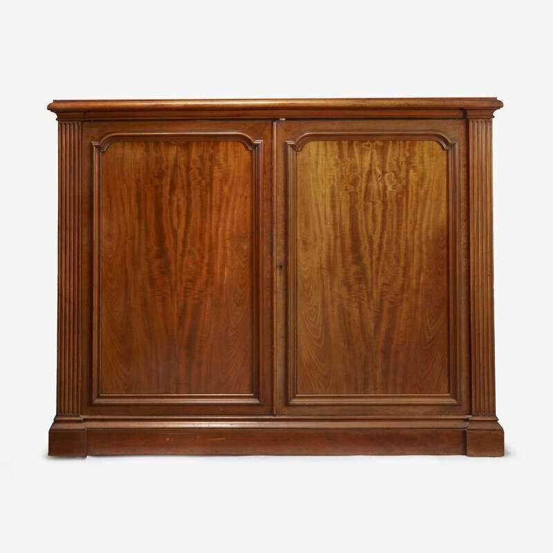 The moulded top over two cabinet doors flanked by fluted pilasters.