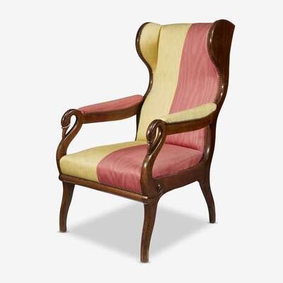 The chair with upholstered wings, arms, and sear, the supports in the form of swan's necks above splayed feet.