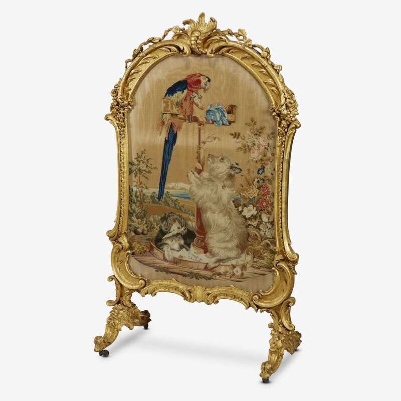 The scrolling rocaille decorated crestrail above a molded frame on curving splayed feet with castors, the whole framing a Berlin woolwork panel after Edwin Landseer, Queen Victoria's Pets, circa 1850.