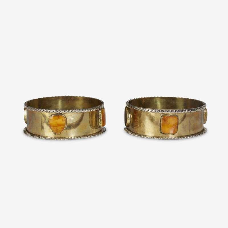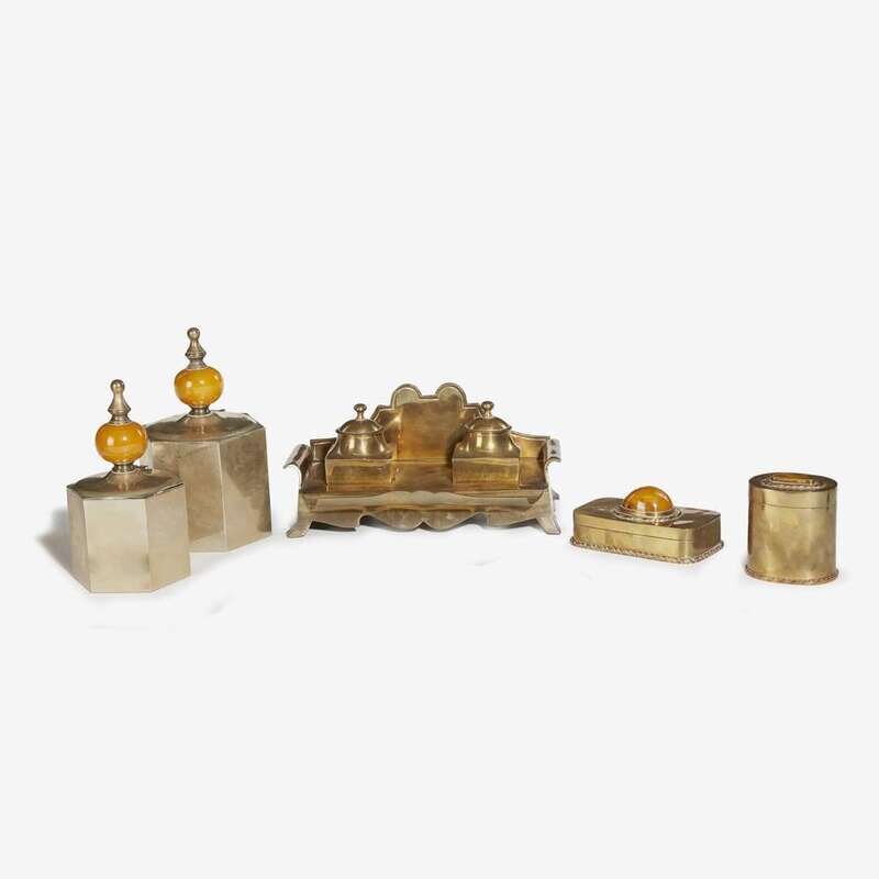 Comprising two wine coasters with simulated agate insets, two inkwells with stand, two felt-lined lidded containers with amber-colored and brass finials, one rectangular stamp box, the lid mounted with domed simulated agate surrounded by mixed metal roping, and one rounded container with triangular-shaped simulated-agate inset surrounded by mixed metal roping. (9).