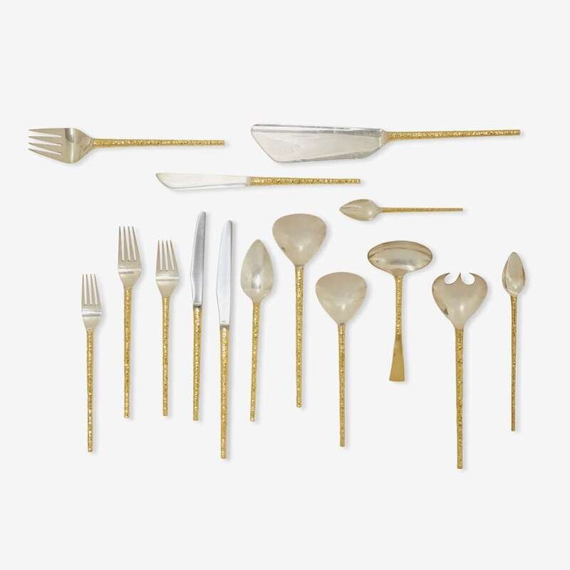 A set of hand-forged flatware comprising eleven each table forks and knives, fish forks and knives, dessert forks and knives, soup spoons, table spoons, iced tea spoons; twelve teaspoons; two each serving forks, ladles, fish servers; three pairs of salad serving spoons and forks. (123).