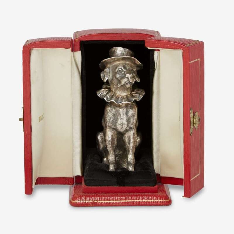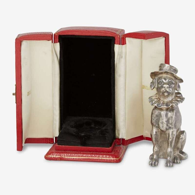 A sterling silver dog-form caster with Bulgari custom presentation case James Barclay Hennell, London, 1877-78