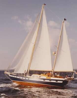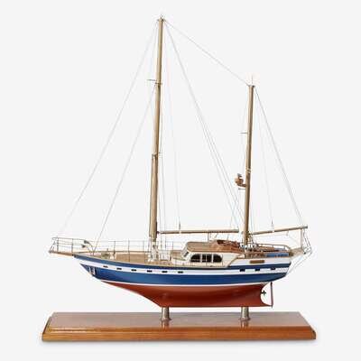 With red, white and blue hull, having two rigged masts, with anchor, steering wheel, compass, seat cushions, deck rails, and other highly detailed fittings.