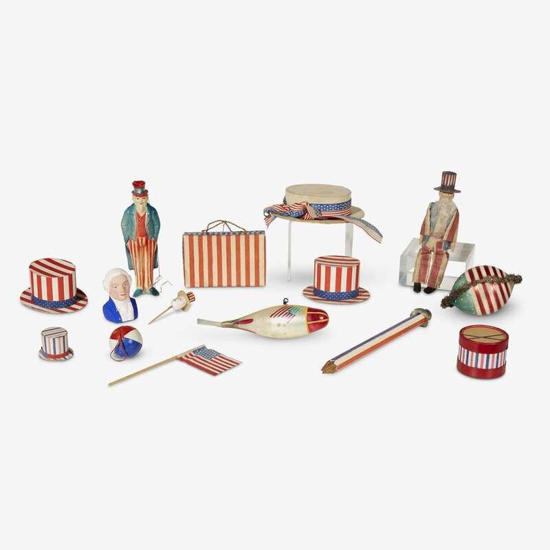 Including numerous postcards, children's books, figures of Uncle Sam, glass and wooden ornaments, candy containers with patriotic themes, pencils, campaign buttons, various vintage printed small and miniature flags, printed paper ornaments with angel hair, and red, white, and blue pencils.