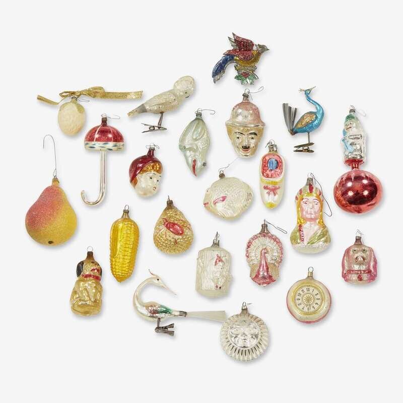 Including fish, turkey, owls, clowns, Santas, dogs, parasols, houses, lamps, squirrels, bells, head of American Indian, Charlie Chaplin, figure of "Foxy Grandpa," shoes, baskets of flowers, watch, heart, small kugels, and many more. (approx. 150).