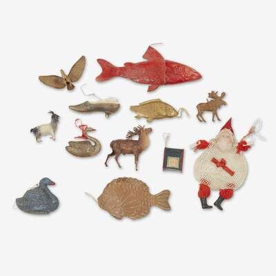 Including two moose, three fish, swan, shoe, leather mailbox, goat, and net bag with celluloid Santa face. (10).