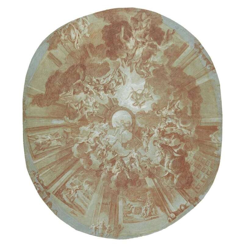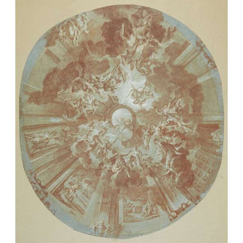ATTRIBUTED TO LUCA ANTONIO COLOMBA (ITALIAN 1674-1737) AENEAS IN OLYMPIA; AND THE OVERTHROW OF THE TITANS: DESIGN FOR A CUPOLA