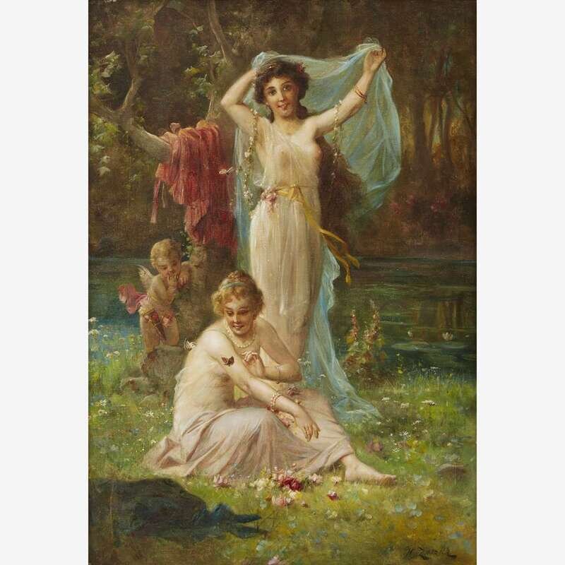 HANS ZATZKA (AUSTRIAN 1859-1945) MAIDENS IN A GLADE, CUPID ONLOOKING