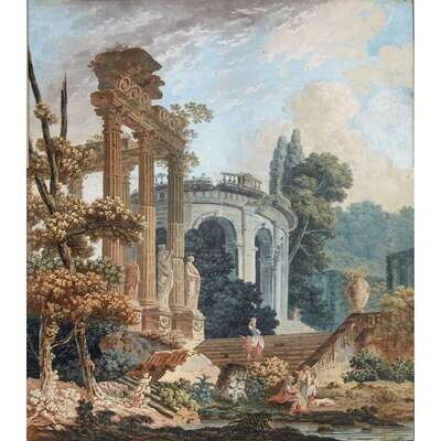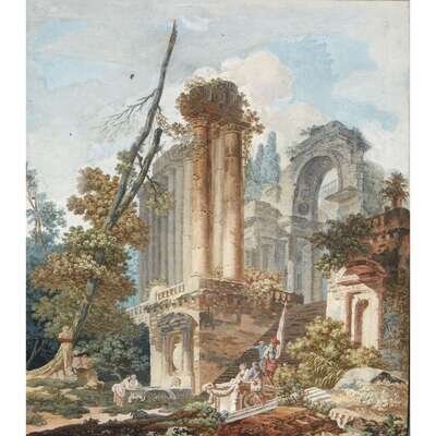 ATTRIBUTED TO HUBERT ROBERT (FRENCH 1733-1808) CAPRICCIO WITH ELEGANT FIGURES; AND A COMPANION