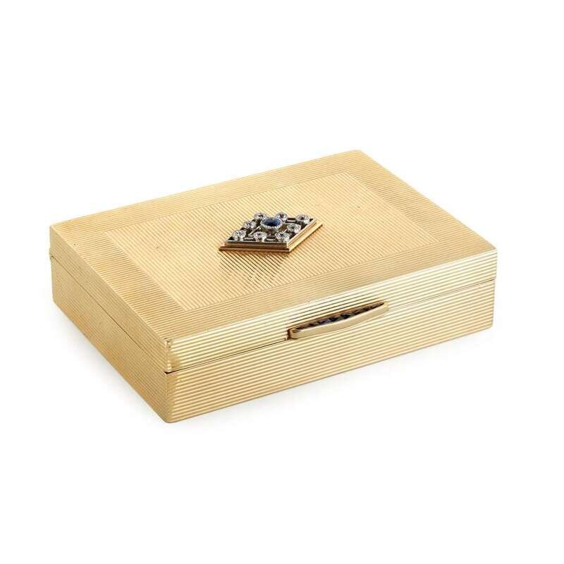 reeded design, red lacquer linking accented by sapphire and diamond navette and channel; set sapphire thumbpiece.