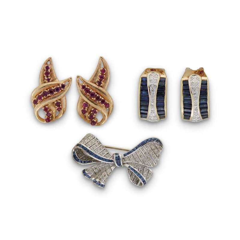 including two pairs of earrings and one brooch set with either sapphires or rubies and accented by round brilliant and single-cut diamonds; estimated total diamond weight: 0.35 carat.