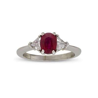 centering one oval ruby, weighing approximately 1.20 carats, flanked by two triangular shape diamonds; estimated total diamond weight: 0.45 carat.