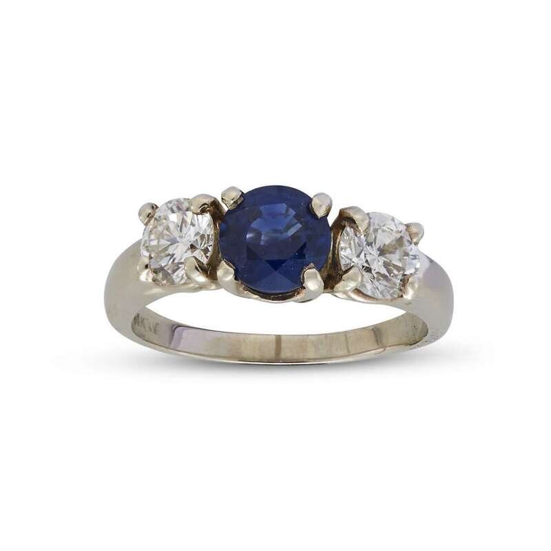 signed for fourteen karat, centering one round sapphire, weighing approximately 1.40 carats, accented by round brilliant-cut diamonds; estimated total diamond weight: 1.05 carats.