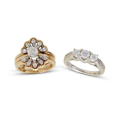 both signed for fourteen karat and set with round brilliant, old European and single-cut diamonds; estimated total diamond weight: 1.65 carats.