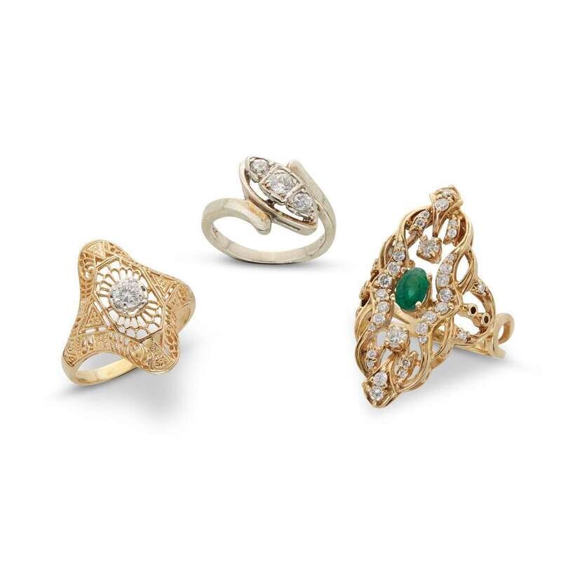 all three signed for fourteen karat and set with round full-cut diamonds; estimated total diamond weight: 1.15 carats.