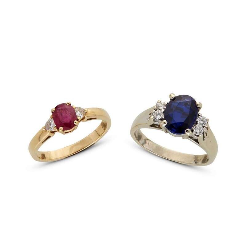 both signed for fourteen karat, centering either a ruby or a synthetic sapphire and accented by triangular or round brilliant-cut diamonds; estimated total diamond weight: 0.35 carat.