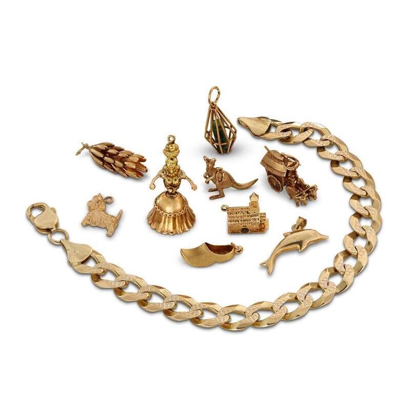 A gold bracelet and nine charms