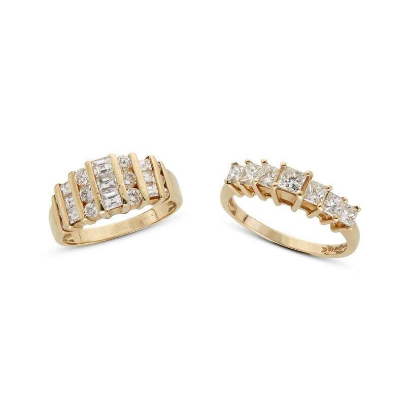 both signed for fourteen karat and set with princess, baguette and round brilliant-cut diamonds; estimated total diamond weight: 2.10 carats.