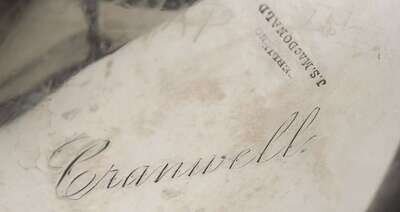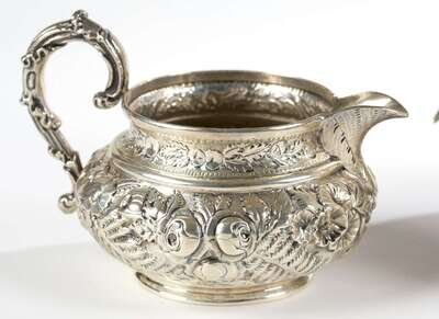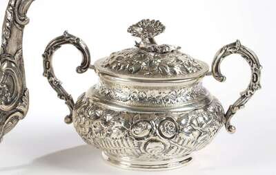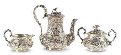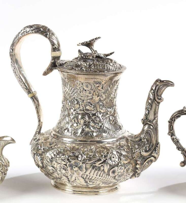 Comprising teapot, covered sugar and creamer, floral repousse, flower finial to the lids, c-scroll handles, engraved on underside "Cranwell." (3).