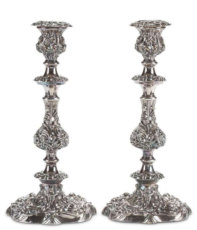 A pair of silver repousse candlesticks