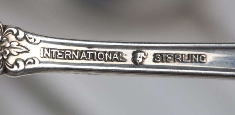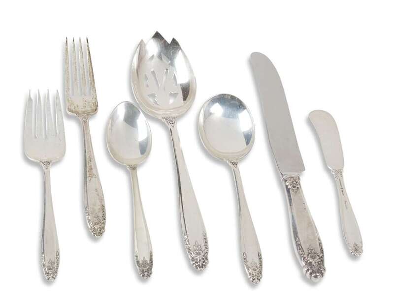 Comprising eight dinner forks, nine dessert forks, ten teaspoons, eight cocktail forks, eight soup spoons, one serving piece, seven butter spreaders and eight dinner knives with steel blades. (59).