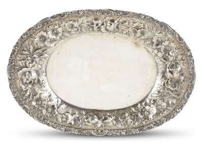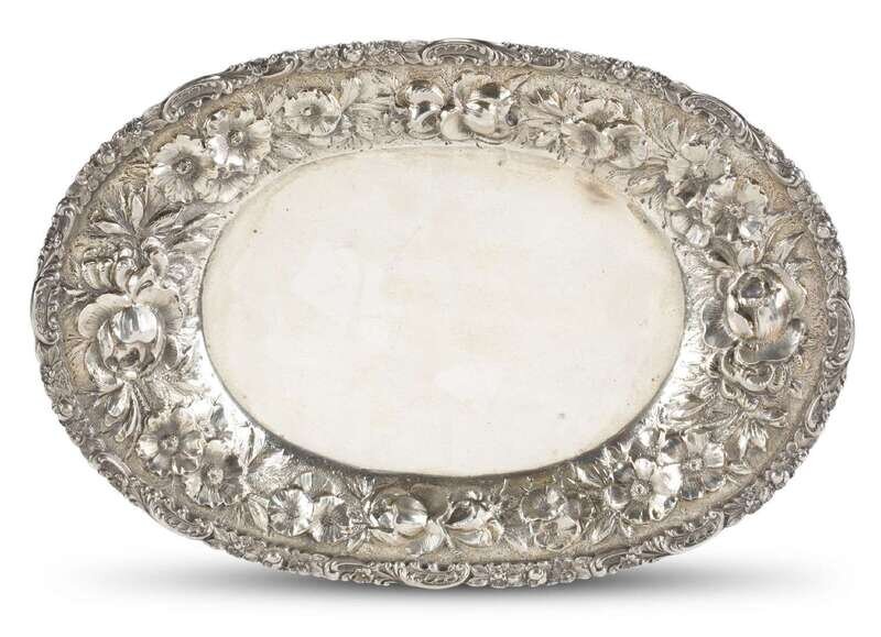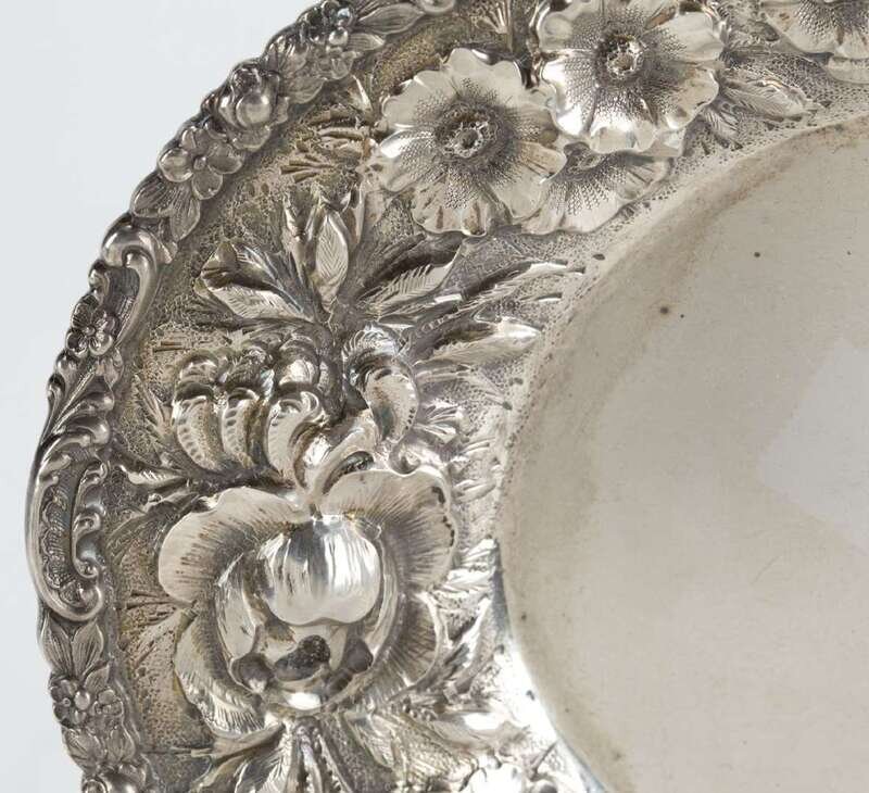 Heavily-worked floral repoussé on stipple ground.