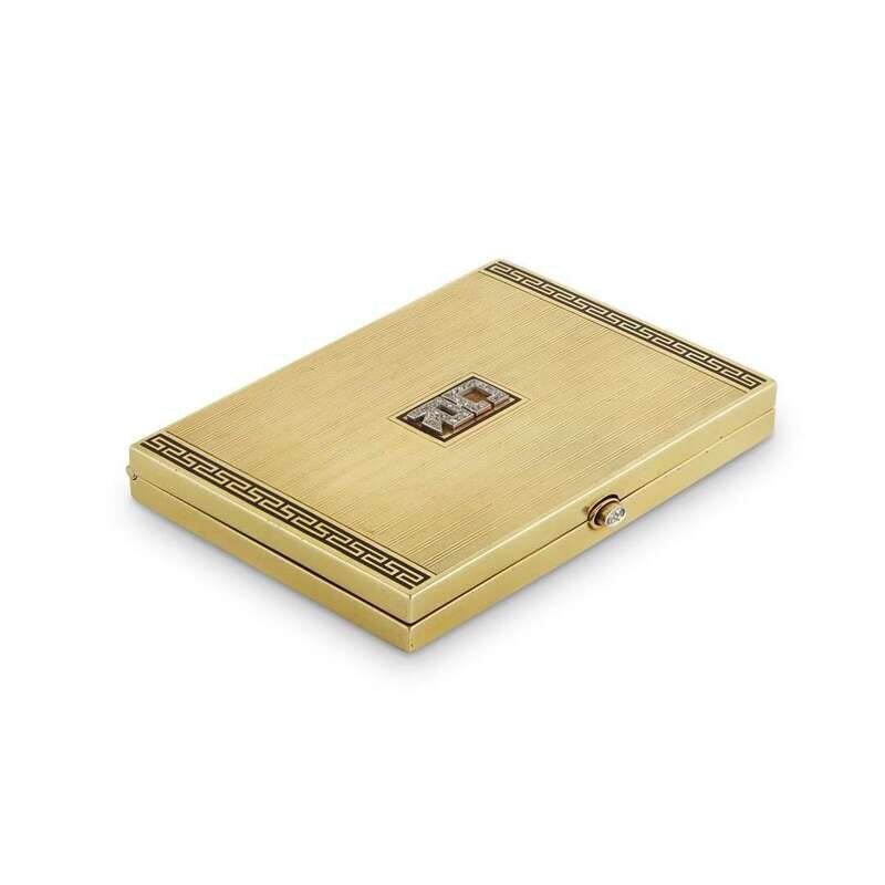 reeded design with black enamel border, diamond monogram with 'C.R.' initials, single-cut diamond thumbpiece.