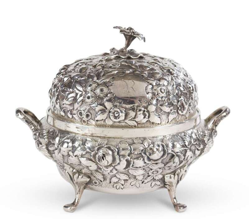 heavy chased floral repousse with double handles and monogrammed "R" cartouche.