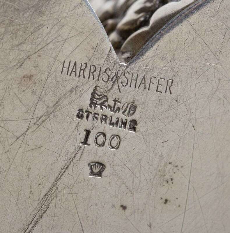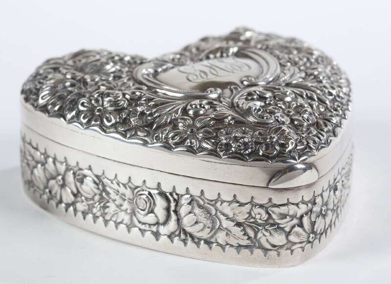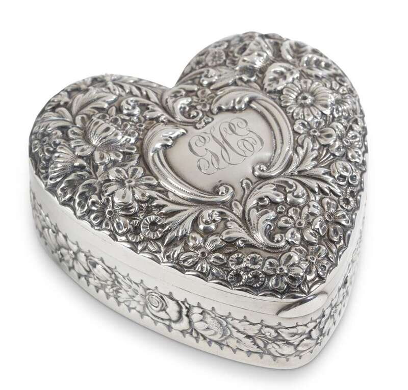 Retailed by Harris & Shafer, heart shaped repousse jewelry box, cushion interior, monogrammed.
