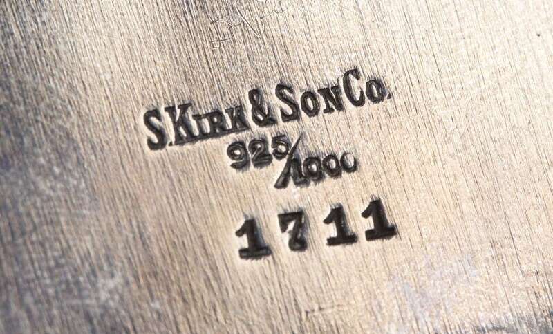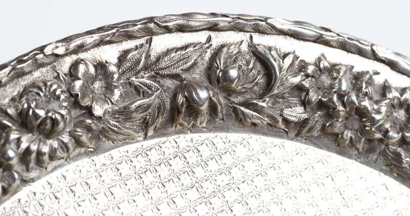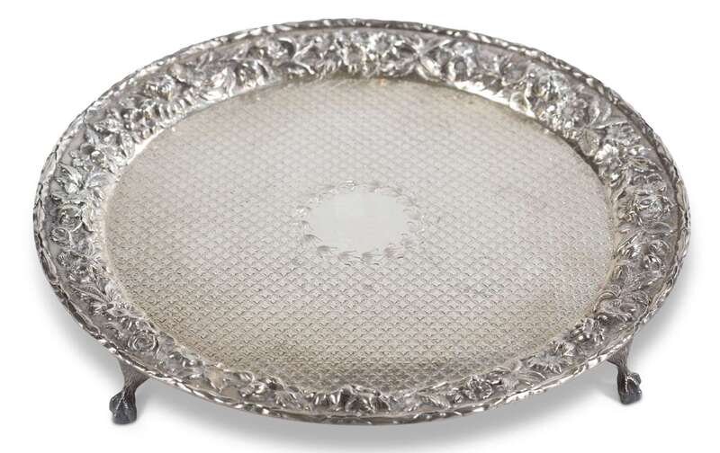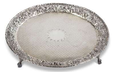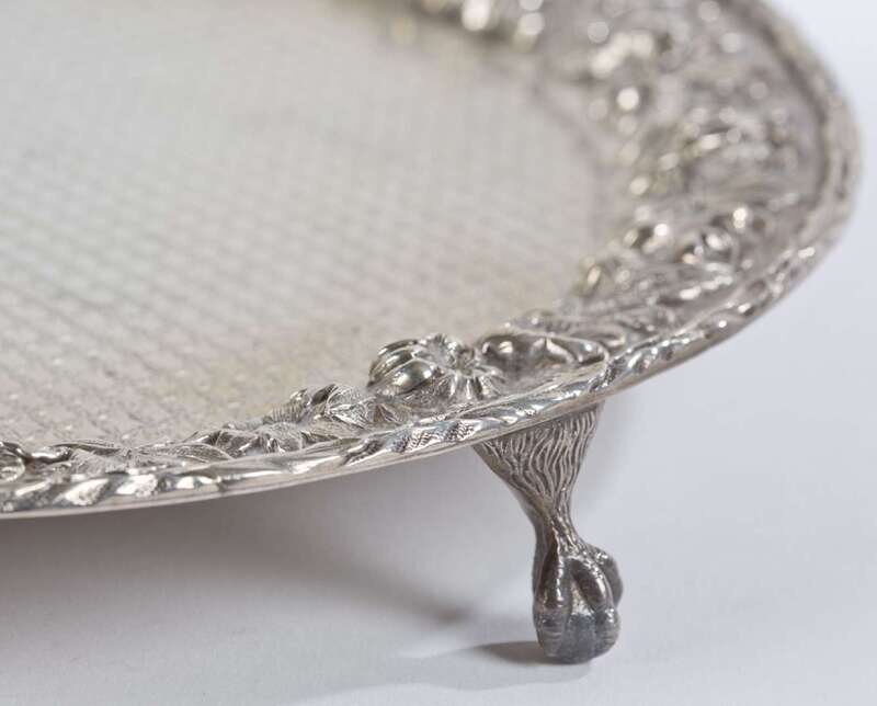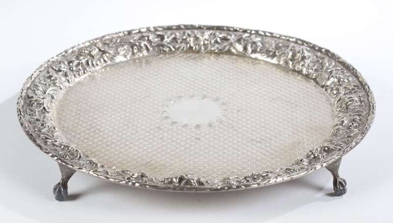 Repousse rim, diamond pattern with blank central medallion, rests on claw and ball feet, #1711.
